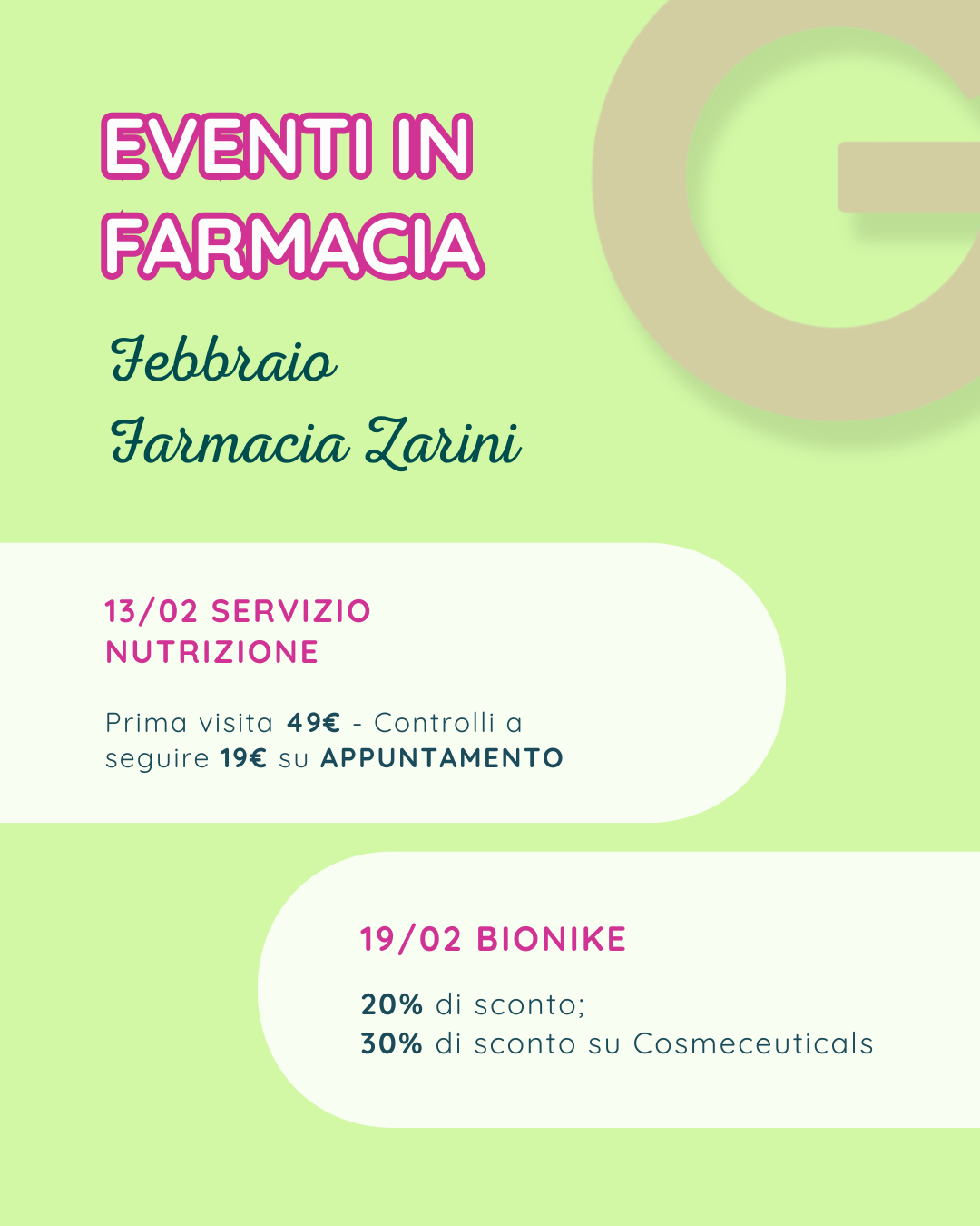 Scopri tutti gli eventi e le giornate promozionali di febbraio presso la Farmacia Zarini per prenderti cura di te e risparmiare su dermocosmesi, benessere e tante altre offerte.