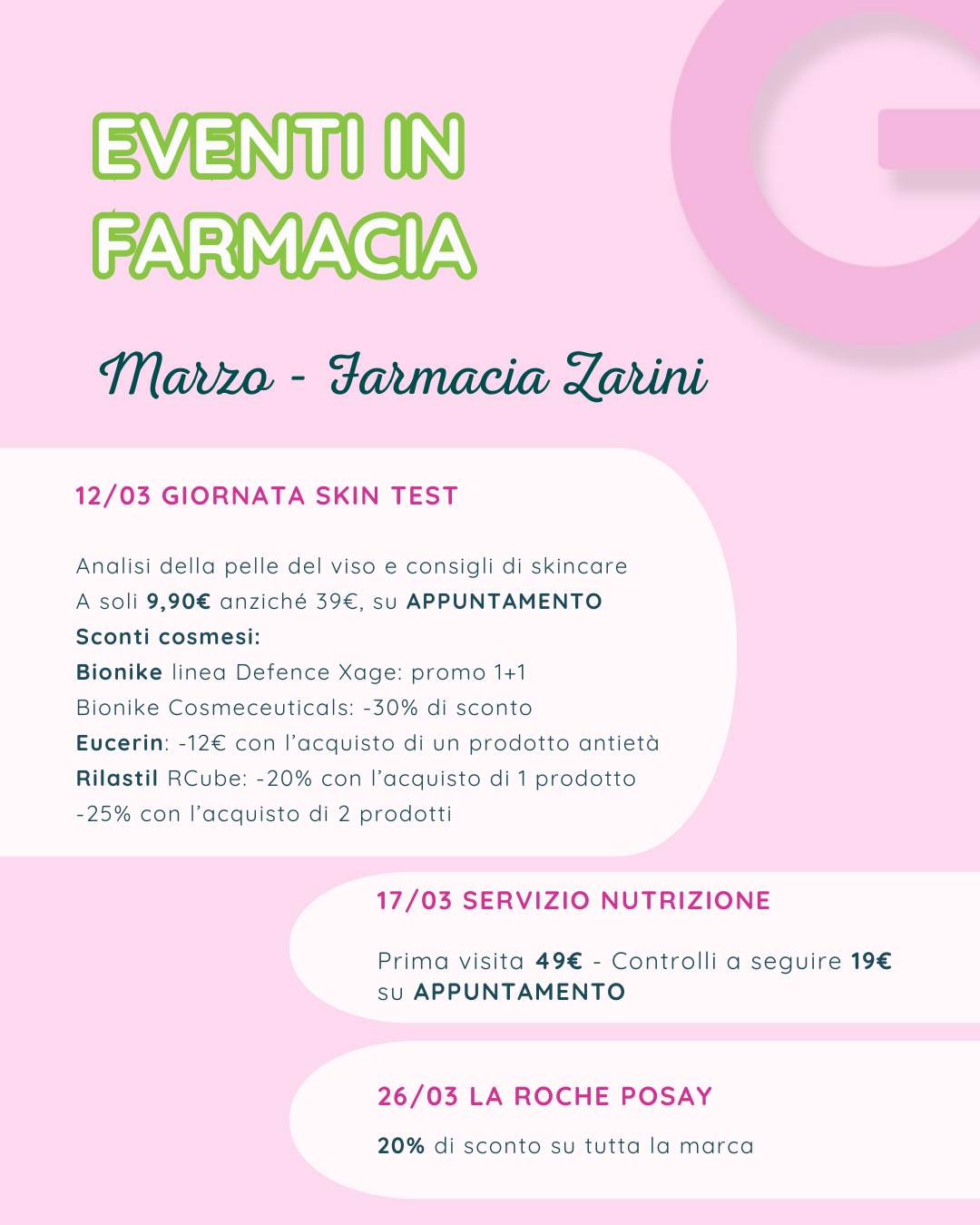Scopri tutti gli eventi e le giornate promozionali di marzo presso la Farmacia Zarini per prenderti cura di te e risparmiare su dermocosmesi, benessere e tante altre offerte.